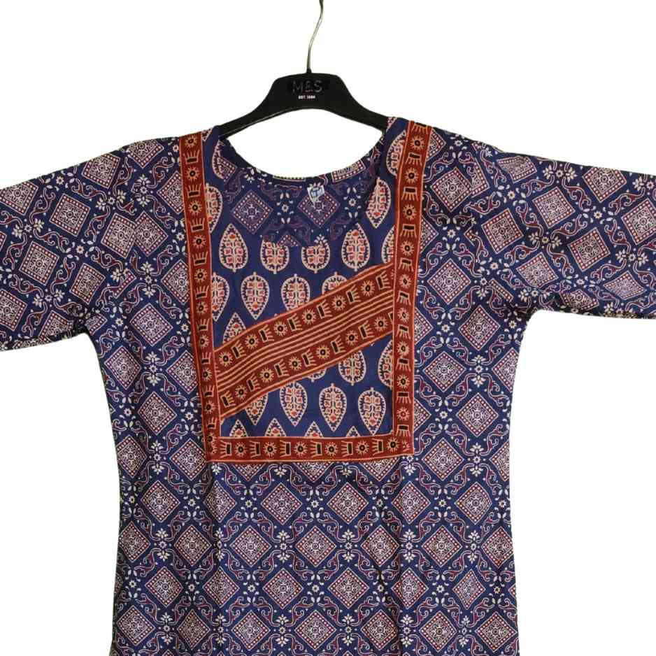 Step into effortless elegance with our Pure Cotton Ajrak 2-Piece Set, a perfect blend of tradition, comfort, and style. This set features a knee-length kurta with half sleeves and a striking Ajrak print that celebrates rich cultural heritage with its deep indigo and earthy red hues. The front yoke is intricately designed with a unique block-printed panel that adds a bold touch of ethnic artistry.